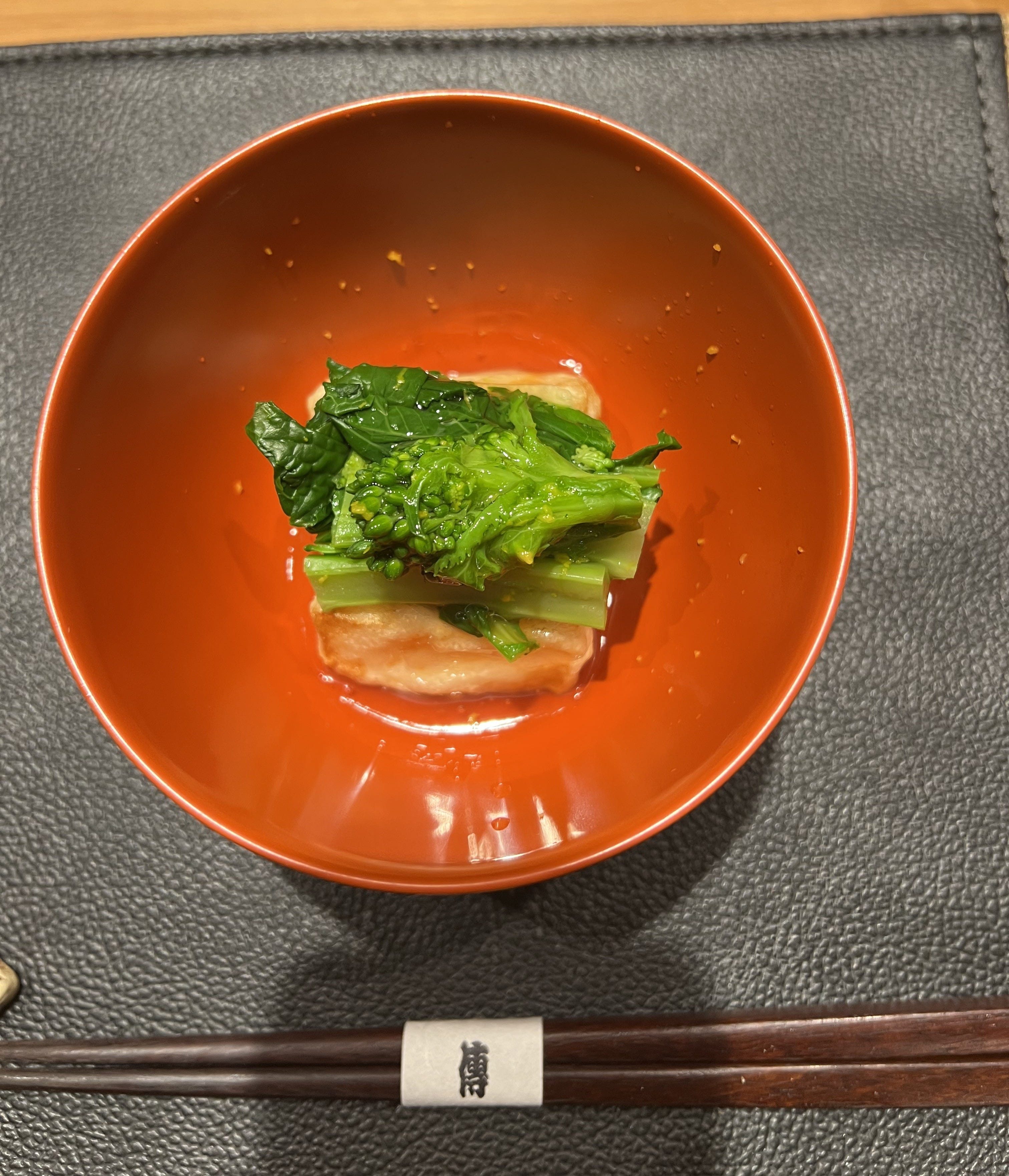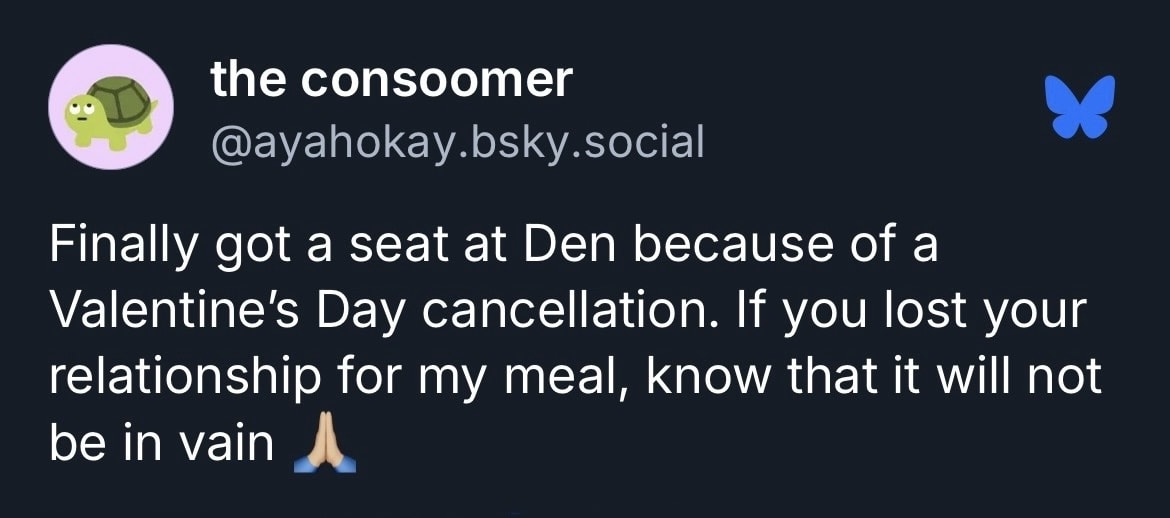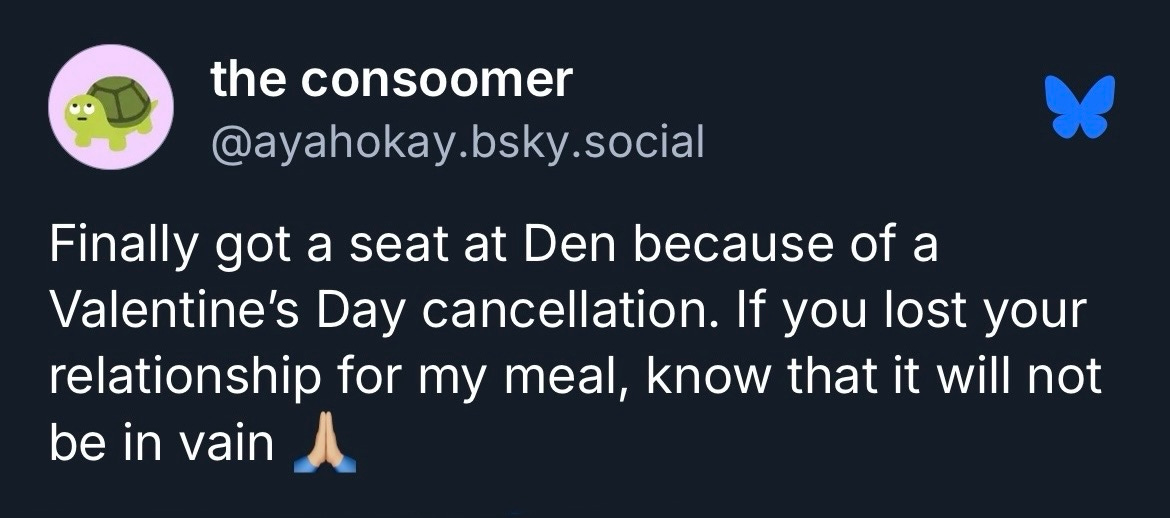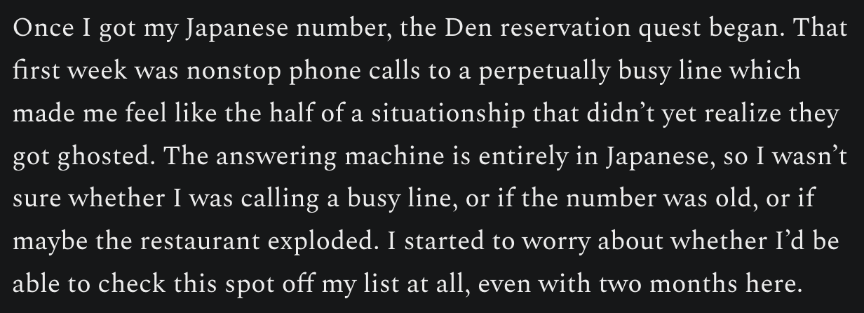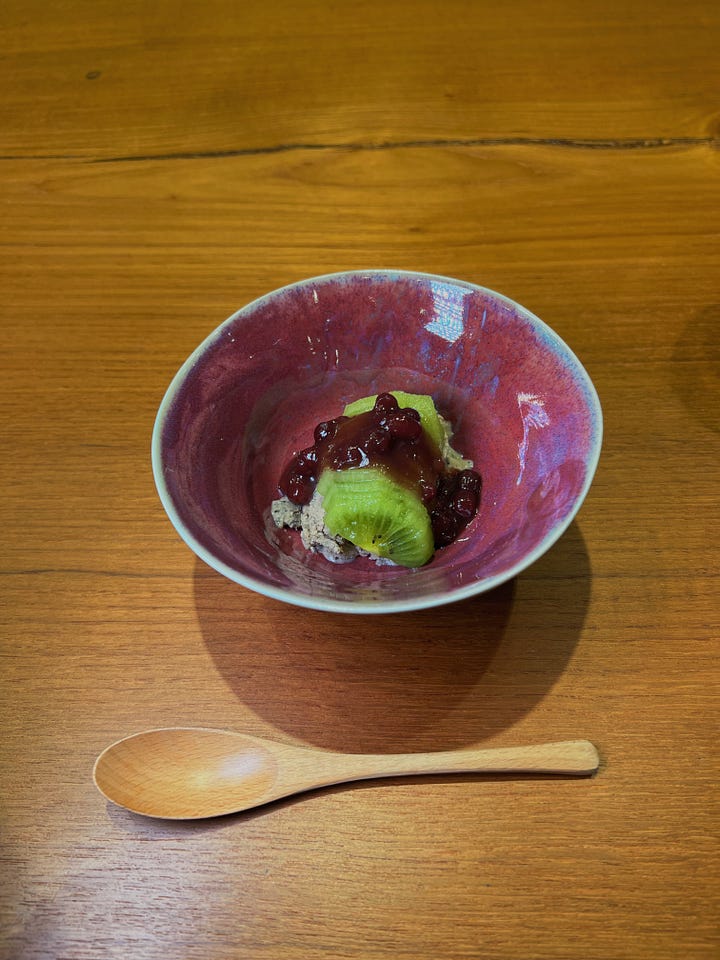 I always write notes on my phone at tasting menus—my friend Josh tells me this is gonna scare restaurants into thinking I’m a secret reviewer, but if a chef sees a gigantic keylight getting pointed at the food and still believes I’m exercising the discretion a reviewer needs, that’s their problem. And usually my notes are just on the food – tastes, feelings, a rating. But at Den, they’re interspersed with stories from the people around me – Noriko’s favorite ramen spots, highlights from Chris and David’s recent visit with family in Vietnam, Jin’s worldwide restaurant shortlist. (I’ll include them all at the end of this piece.)