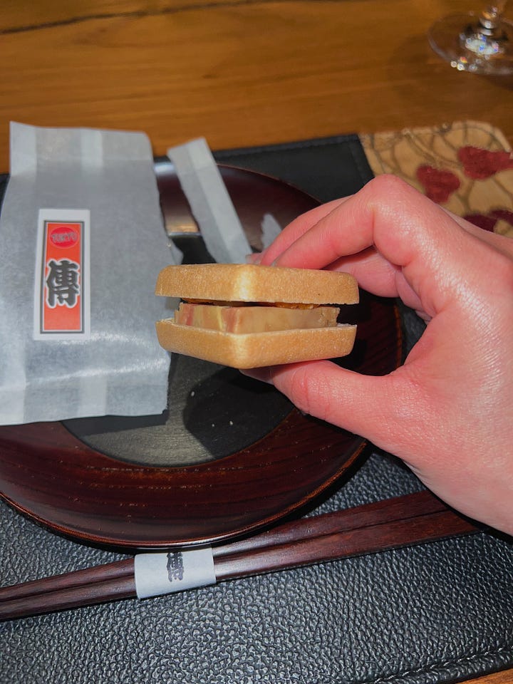 The course immediately opened with a twist: a monaka wafer, traditionally offered as wagashi, sandwiching foie gras, pickled daikon, and persimmon paste. It was very pastelike and cloying, an interesting blend of flavors.