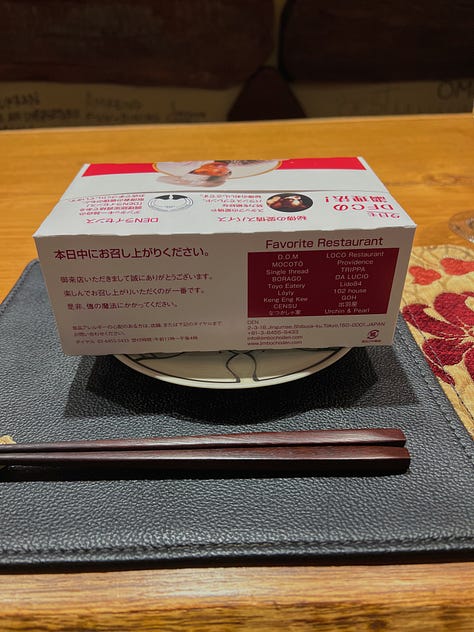 Despite doing this for over fifteen years, it didn’t feel gimmicky or performative. In a city as fast-paced and steely as Tokyo, Zaiyu and Emi Hasegawa and their team at Den are a haven of jovial hospitality. My experience at Den is, to me, emblematic of the very best of Japanese culture and cuisine.