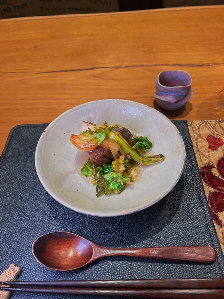 The iconic mainstays like the rice-stuffed chicken wing and salad-twenty-ways have been on the menu for over a decade. Those already familiar with Den from the hype may also feel disappointed if they only walk in expecting new gimmicks. (Though Noriko did tell me that the menu shifts for repeat diners. Don’t despair too much over that, apparently it’s way easier to get in after you’ve suffered once!)