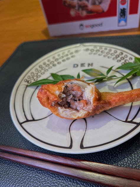 Den’s plating is simple, almost minimalist, but it’s fun. The chicken wing is crispy and juicy, sour from the pickled plum rice stuffed inside.