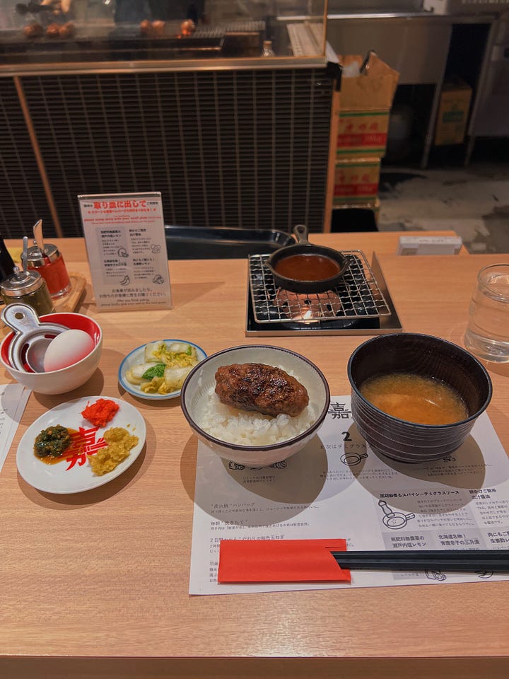 Did the five daily servings of caffeine fail to stunt your appetite and leave you ravenous for actual food? Check out Hamburg YOSHI right next door. The hamburg sets are relatively affordable and absolutely delicious. Don’t skip the egg mixed in rice. (Also known as TKG — the Japanese love abbreviations, and I learned that one from my teacher Rei, which stands for tamago kake gohan)!