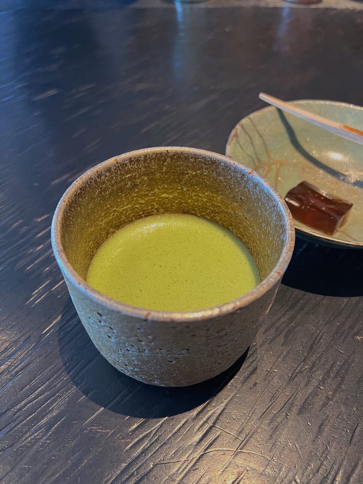 Then came the final course, where I was prompted to choose between three different wagashi. As a certified yuzu fan, I chose the yuzu jelly wagashi. It was served alongside the final tea course, a matcha sourced from the mountainous Kirishima province of Kagoshima.