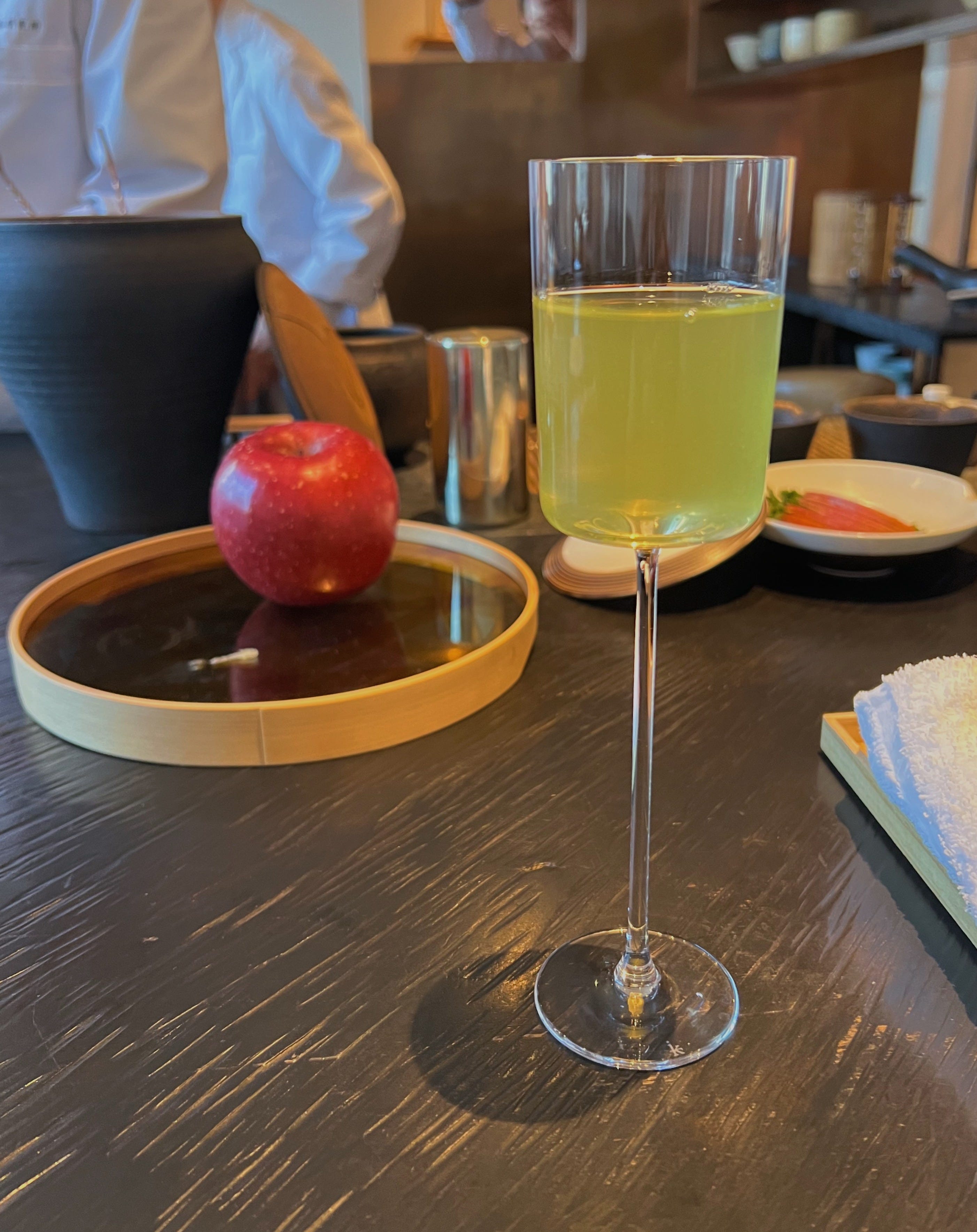 The next course introduced the third and final strain of the gyokuro, this time steeped with freshly-sliced apple. This course was the most complex and intriguing, as the tea harbored all of the brightness and notes of the apple without any of the sweetness. Being the third steep, that overwhelming umami flavor had mellowed out significantly, and the Gyukuro had muted into a normal tasting green tea, which paired beautifully with the apple.