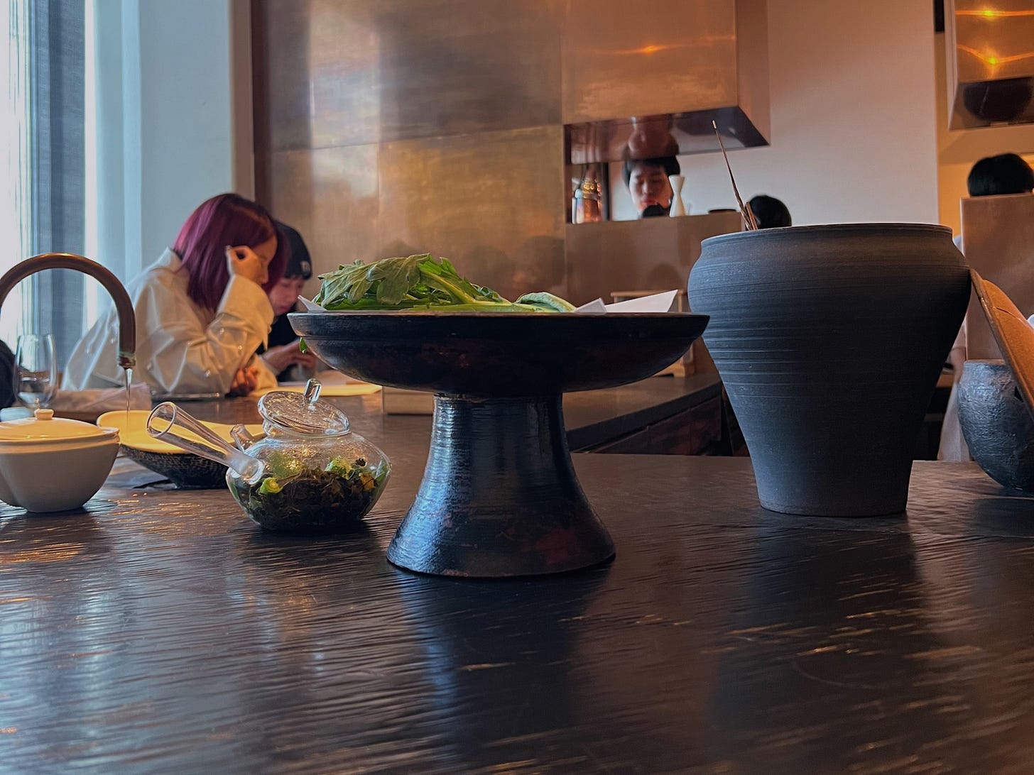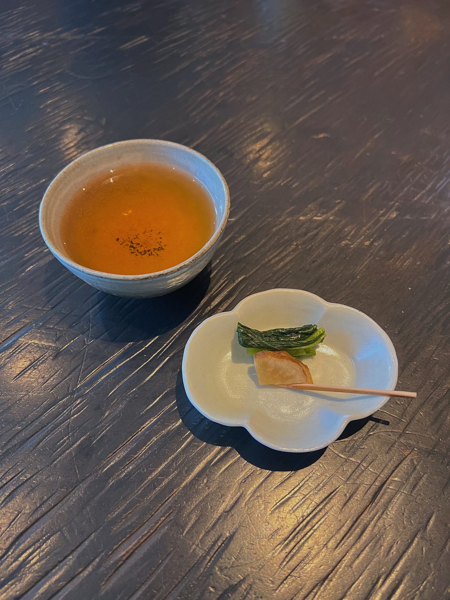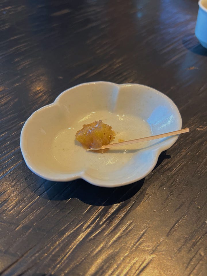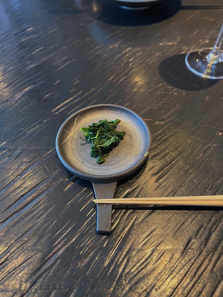 Another snack course followed that I totally wasn’t expecting: the gyokuro leaves from my tea had been assembled into a small plate with a dashi broth poured over, then seasoned with a light ponzu sauce. I took the tiniest bite, expecting another flavor bomb. What it actually ended up being was the best savory bite of the course. The leaves were incredibly tender, and mild enough that they had basically become a vehicle for the ponzu at this point. It was almost like a milder form of spinach – textural, vegetal, and savory, brightened by the ponzu. I could’ve eaten a bowl of the stuff – which you shouldn’t do because I think you’d succumb to a caffeine-induced heart attack. But at least you’d die happy!