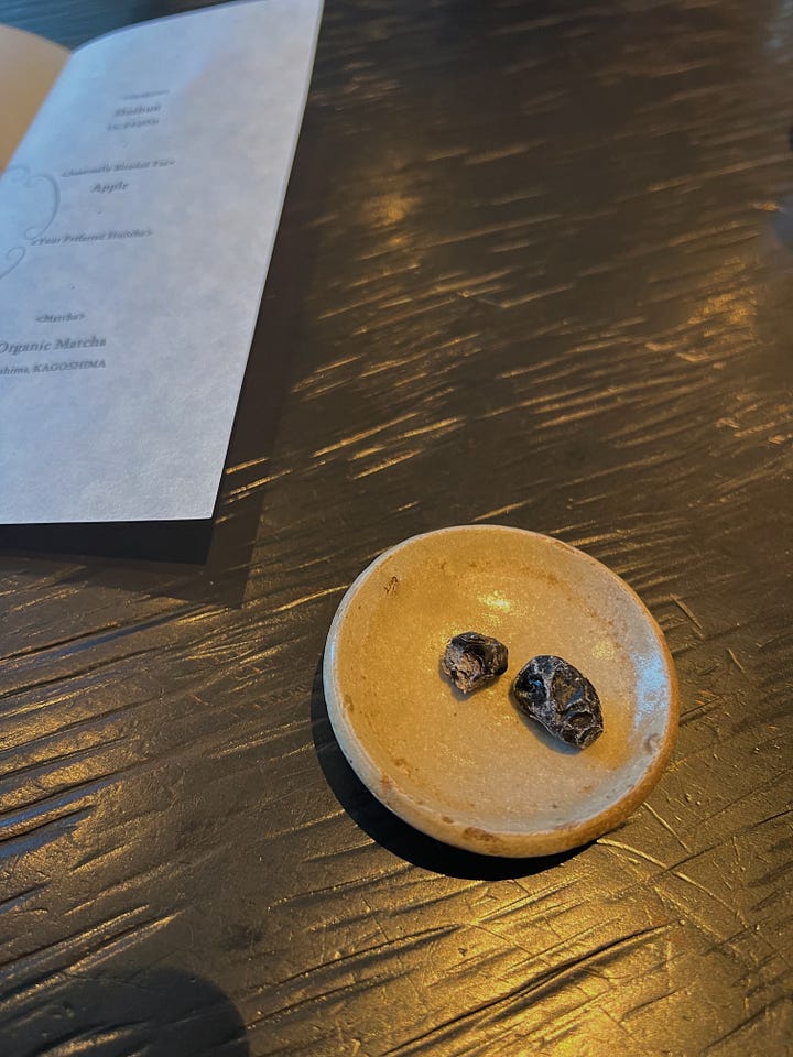 I was then served a second steep, which largely tasted the same – unsurprising given how strong the flavors in the first course were. My first round of traditional Japanese sweets (known as wagashi) followed. The dried, sweetened black soybeans known as kuromame were so good I could’ve eaten a bag of them, and the chestnuts in jelly were delicate and sweet.