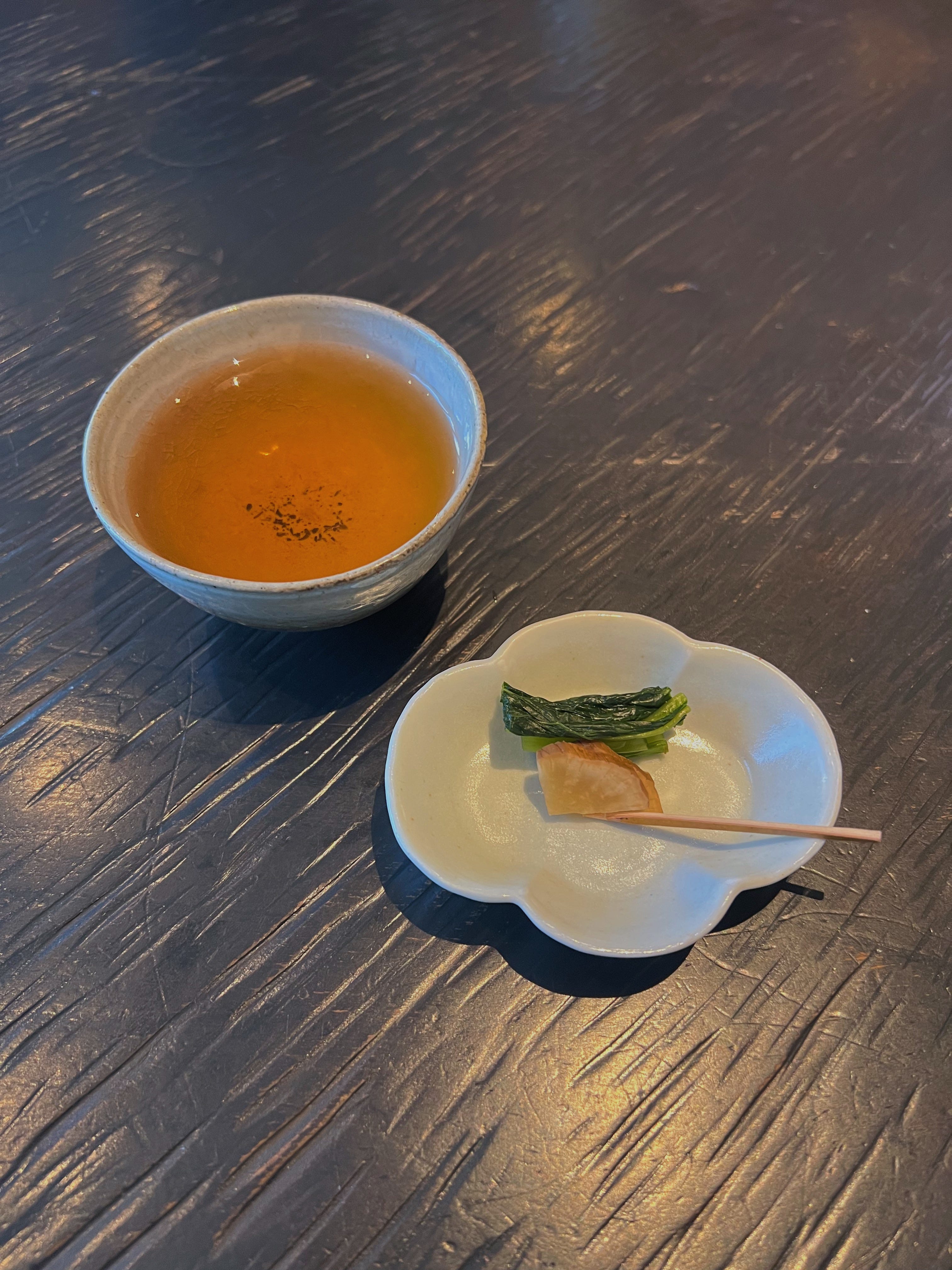 The flavor was warm and toasty, almost reminiscent of Earl Grey, though a bit gentler in structure. Despite the pronounced scent, the tea itself was mild and easy-drinking. A small savory plate of pickled spinach and radish accompanied it — these had a pungent, almost smoky flavor. They were incredibly unique, and I’d never tasted pickles, even here in Japan, quite like them before.