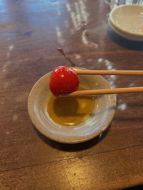 Don’t skip the cherry tomato appetizer — it was so delicious, I had to order two. The space is so cozy — I dined upstairs beside bamboo screens that filtered in soft sunlight. If another month in Tokyo doesn’t totally drain my wallet, I’ll be back. | Beli