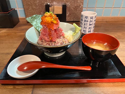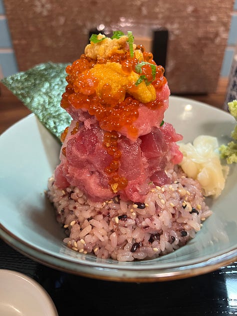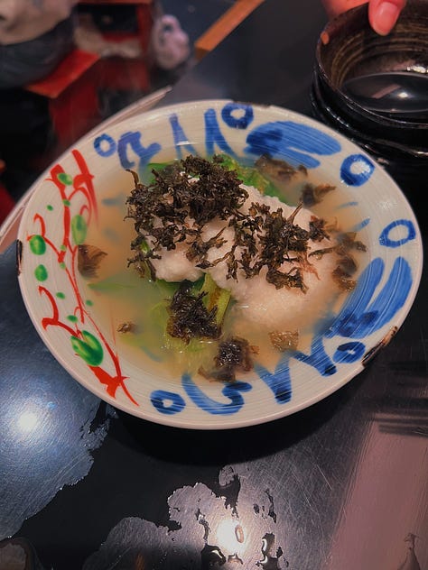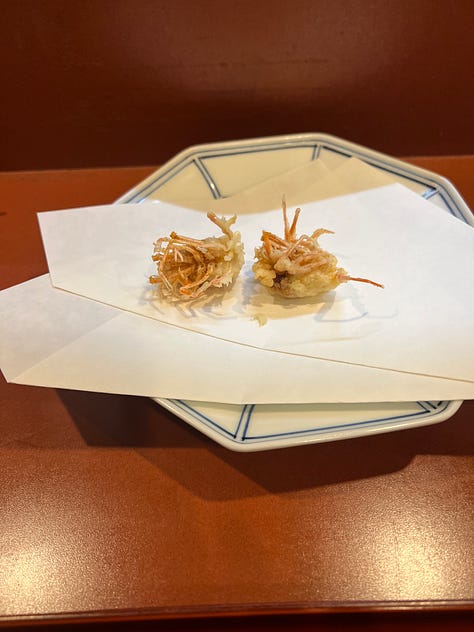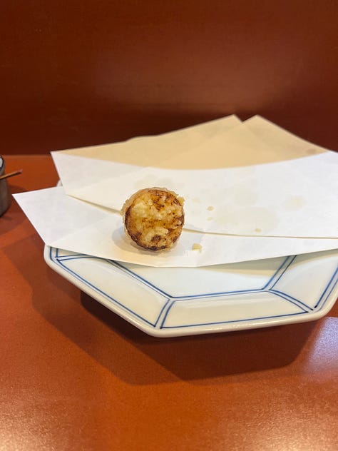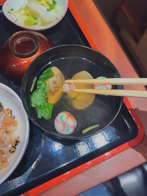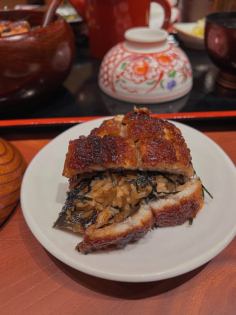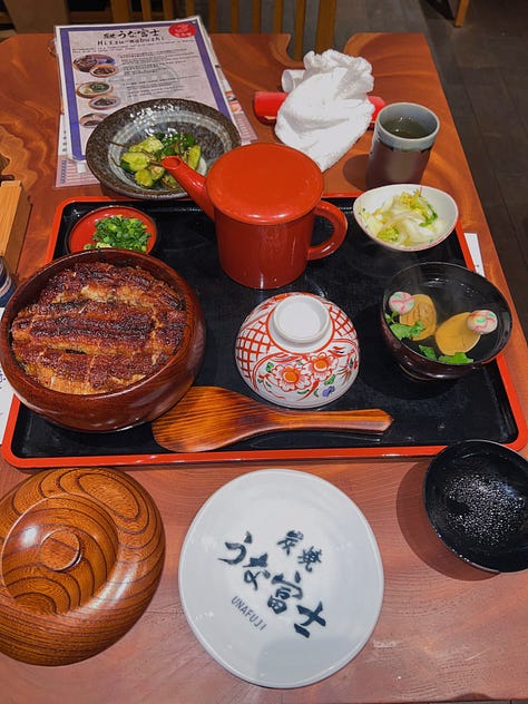 This Nagoya-born hitsumabushi spot has been around for about thirty years, and that legacy shows. The unagi was excellent — sweet, crispy, and perfectly caramellized — but at around $40 USD, it isn’t exactly a casual meal. I later tried a $30 unagi bowl elsewhere that didn’t hold a candle to it, which made me realize unagi might just be expensive everywhere. I also got my first-ever pea crab in the soup (which was delicious)! I’m pretty sure you find a lot of these suckers if you shuck shellfish yourself, but I’m taking this as a sign of good luck anyway.