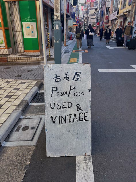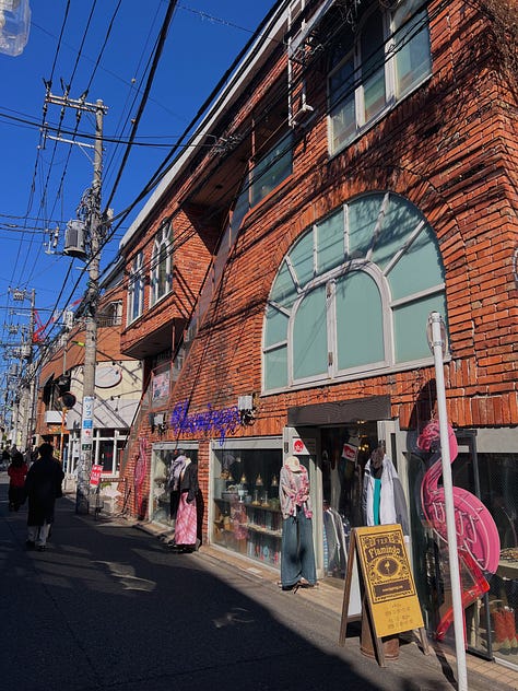 I had fun wandering around and window-shopping in Shimokitazawa (affectionately dubbed “Shimokita” by locals), which is a neighborhood that was trendy about eight years ago. At this point, the “thrifting” prices have become absurd — especially for the bohemian styles, the army surplus, and the American college sweaters that make up about 90% of the racks. It was just a bunch of stuff I’d find at home, only more expensive. One of my language school classmates was similarly underwhelmed, though as a non-American she saw more value in the imported pieces. So, YMMV.