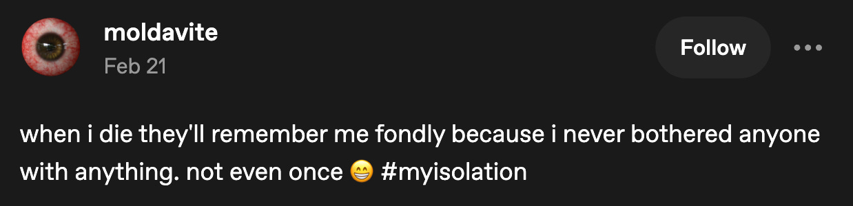 The other reason for getting stuck in my head was that no amount of practiced isolation can make someone immune to needing social contact. I felt listless and unmoored, which immediately pisses me off to read back because I sound like a haunted Victorian woman.